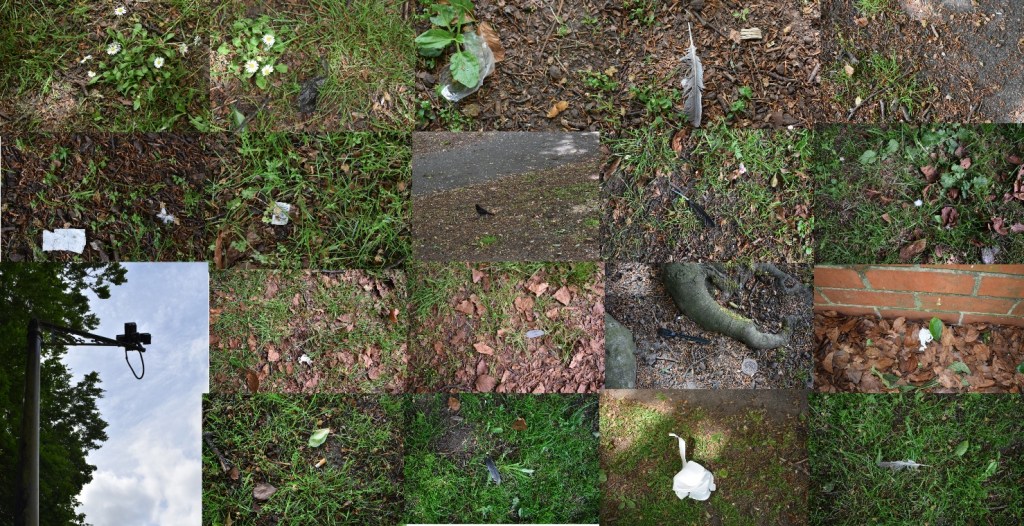 1 tree, 6 feathers, 1 blackbird, 11 pieces of litter, 1 CCTV camera, 1 dog walker, 2 dogs and lots of grass and daisies.