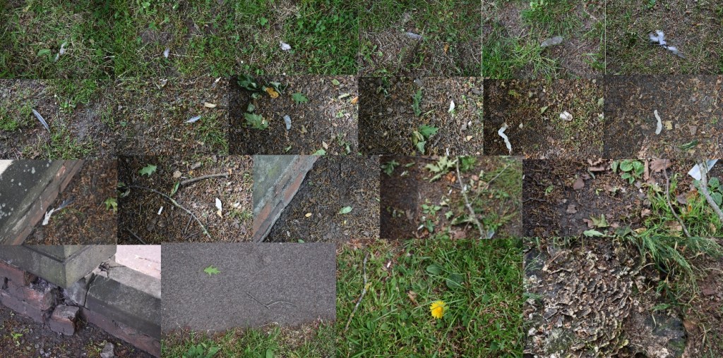 I am in section 6 today so on row 2. I am near a boundary wall still but tomorrow will just be in the park with no wall. Today is cloudy and breezy, not cold but a slight chill, which after yesterday is actually a relief. The park is quiet today, although there is at least one person sitting on each bench. The atmosphere feels relaxed as all around you can see people getting on with their daily lives. Workmen delivering, working up scaffolding and people getting in and out of their cars. In here though it is quiet and stationary with only one dog walker (Dave and Cheri) moving around.