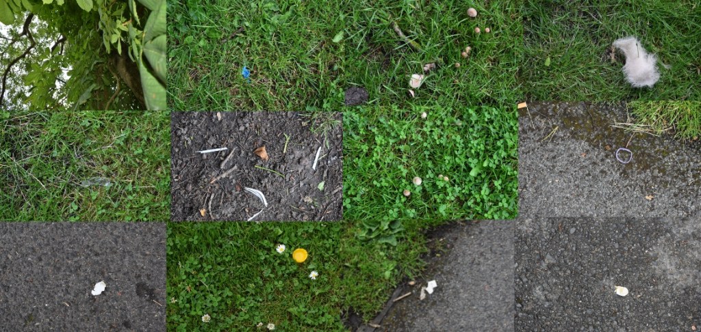 The area today was fairly rubbish free and quite free of anything else really. I saw: 2 halves of trees, grass, clover, mushrooms, path, 1 broken birds egg, 9 pieces of litter.