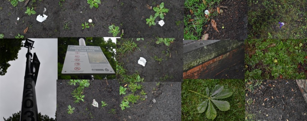 All in all there wasn’t too much to see today and I was hurried by a child who didn’t really want to be there. The large canopy of the horse chestnut covered a lot of the area so there were a few conker cases that have already fallen. The wall has lots of fallen leaves by it and some litter, but nothing was too excessive. I saw : 2 trees, lamppost, path, grass, wall, leaves, conkers in their cases, a COVID sign, 24 pieces of litter (including cigarette ends), daisies and buttercups.