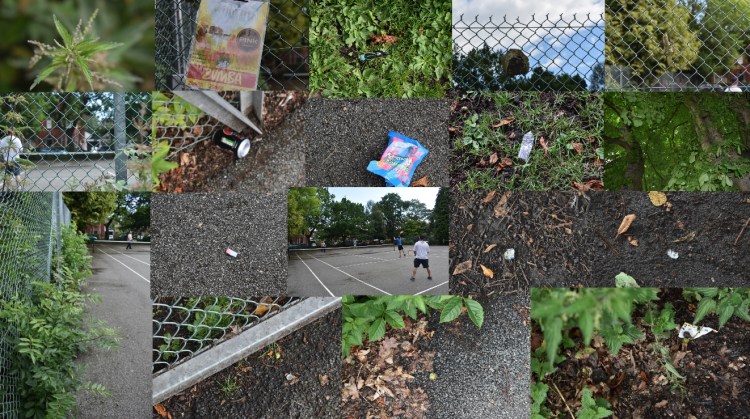 Today I saw: 2 trees, tennis cage, tennis court, bushes, nettles, grass, path, 18 pieces of litter, 2 stuck branches, 2 signs, daisies, clover, conkers, 1 feather, 4 tennis players.