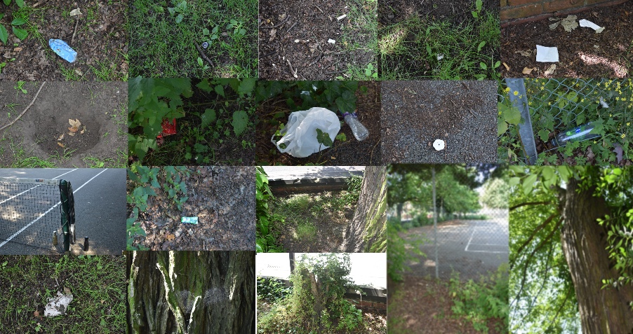 Today I saw: 5 trees, 1 dog and walker, grass, path, wall, lots of undergrowth and nettles, tennis court tarmac, cage, 1 caught branch, 1 tree stump, 1 hole, 26 pieces of litter, 5 feathers, tennis net, tennis bag, 2 water bottles, 8 tennis players (2 households).
