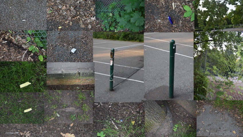 Today I saw: 3 trees, 1 tennis court, cage, tarmac, paving path, grass, undergrowth, nettles, tennis net, empty pole, markings, daisies, mud, 1 manhole cover, 1 drain cover, tree roots, wall, 64 pieces of litter (mainly cigarette ends), 4 feathers.