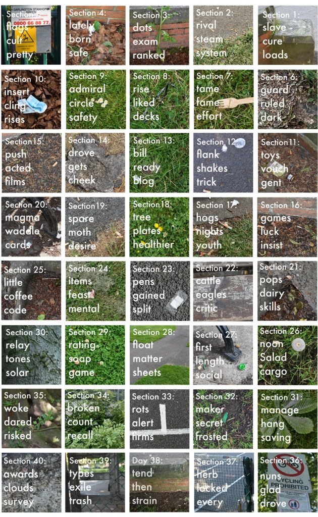 This image shows a photo taken from each of the different sections and how they were laid out and in which order I visited them. You can see the What3words for each section.