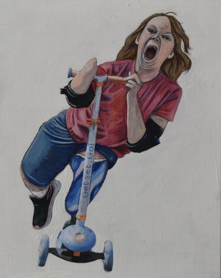 Speed (girl on scooter) – gouache, pencil and collage on board – 20x30cm