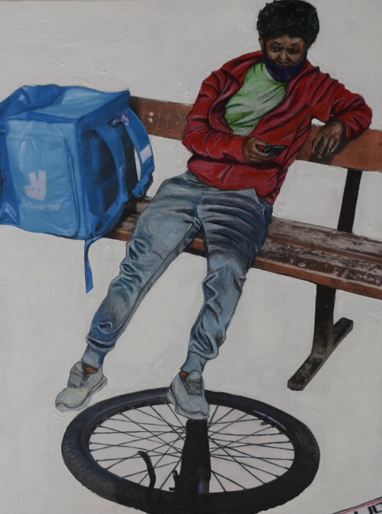 Deliveroo break – gouache, pencil and collage on board – 40x30cm
